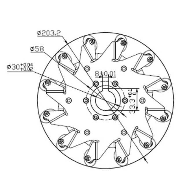 The (8 inch) 203mm Right stainless steel mecanum wheel is a heavy duty wheel. There are two types of 203mm steel body mecanum wheel: left and right. Two right and two left mecanum wheels constitute a basic 45-drgree mecanum wheel driving system. Each wheel is comprised of 12 Polyurethane Rollers wheel hub is aluminum material the wheel is 45-degree light load mecanum wheel.