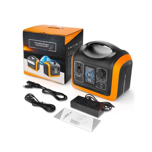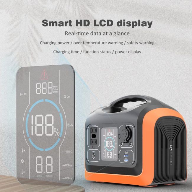 Aan de voorkant van de 600W Portable Power Station bevindt zich een duidelijk display. Hierop kun je de input en de output in Watt, Volt en Ampère in de gaten houden. Ook geeft het display de oplaadstatus van de accu aan. Er wordt aangegeven hoeveel uren of minuten het nog duurt om de accu volledig op te laden, of hoe lang de 600W Portable Power Station het aangesloten apparaat nog van energie kan voorzien.