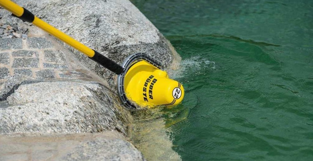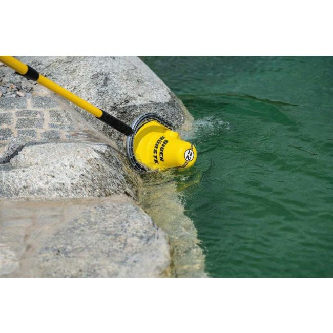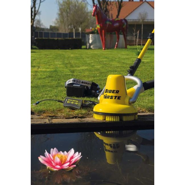 BIBER 22 VIJVERBORSTEL met telescoop steel GRP uitschuifbaar 2,5 - 5,0 m, schakelunit, 2x Li-Ion accuset en 1x gele en 1x rode borstel.
