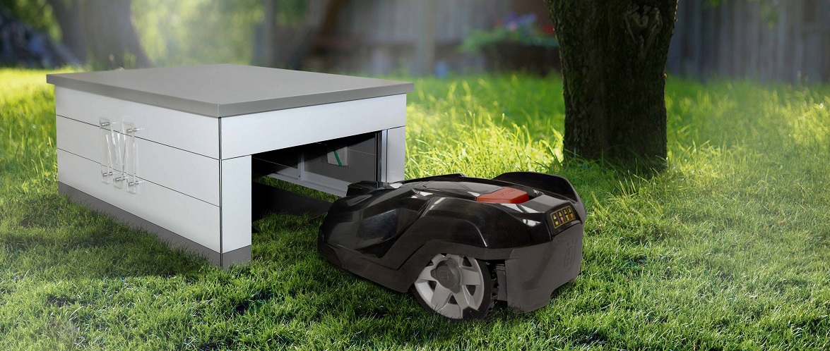Een echte garage voor uw Robotmaaier, wordt geproduceerd in vele uitvoeringen en kleuren. Sterk en robuust dankzij de bouwmaterialen, Elegant door zijn unieke Italiaanse ontwerp, Veilig dankzij het bevestigingssysteem op de grond en uw robotmaaier is beschermd tegen diefstal dankzij de automatische roldeur. De automatische roldeur is gesynchroniseerd met de vertrektijden van uw Robotmaaier. Het paneel bestaat uit samengesteld aluminium met een kunststof dikte van 4mm die ongelooflijk schokbestendig is en bestand tegen extreme temperatuurschommelingen. Dankzij de makkelijk te openen deksel voorzien van een gasveer kunt u makkelijk bij de aansluitingen van uw Robotmaaier. Naar wens kan de ingang van de roldeur worden voorzien van LED-verlichting.