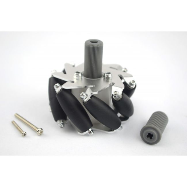 The 60mm aluminum mecanum wheel is the smallest size mecanum wheel in all of our mecanum wheels. the set of 60mm mecanum wheels includes 2 left wheels and 2 right wheels. It is a LEGO compatible mecanum wheel, it comes with an NXT compatible hub and an axle centre hub for the arduino motors and wheels.