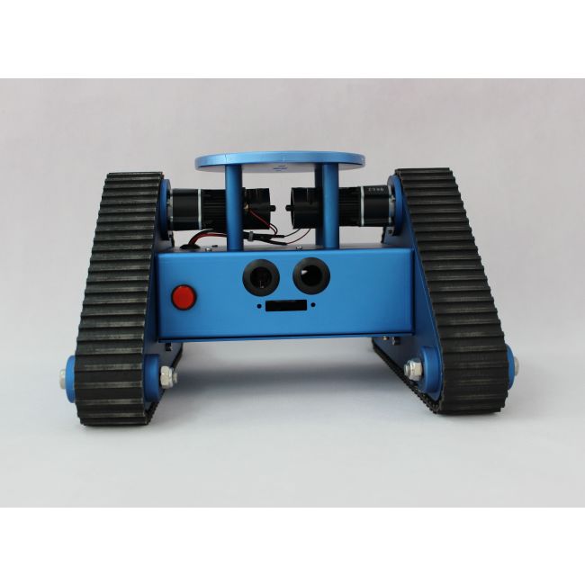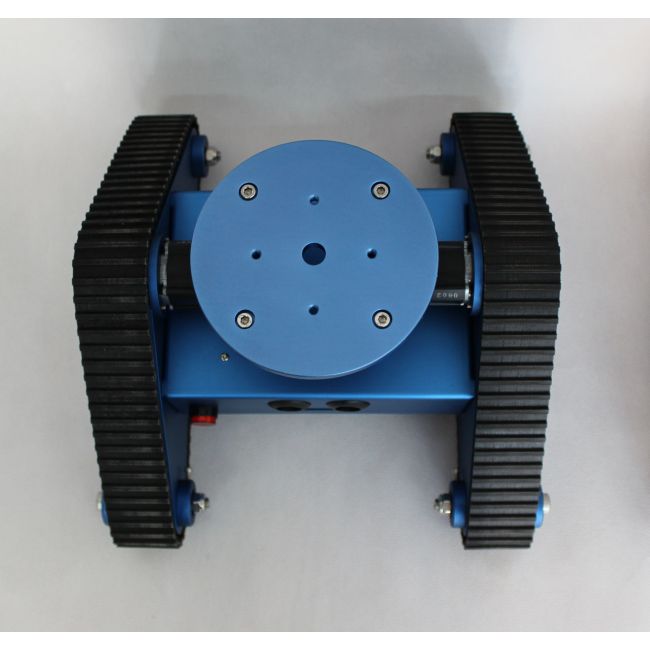 This kit has an aluminum chassis which it is surface was anodized to blue color. Included a robust aluminum chassis with track tank wheel, rubber tracks, microcontroller, and DC motors. Additional, it especially designed a circular plate on the top with some pre-drilled holes for expansion, such as cameras or a micro robot arm, etc.
