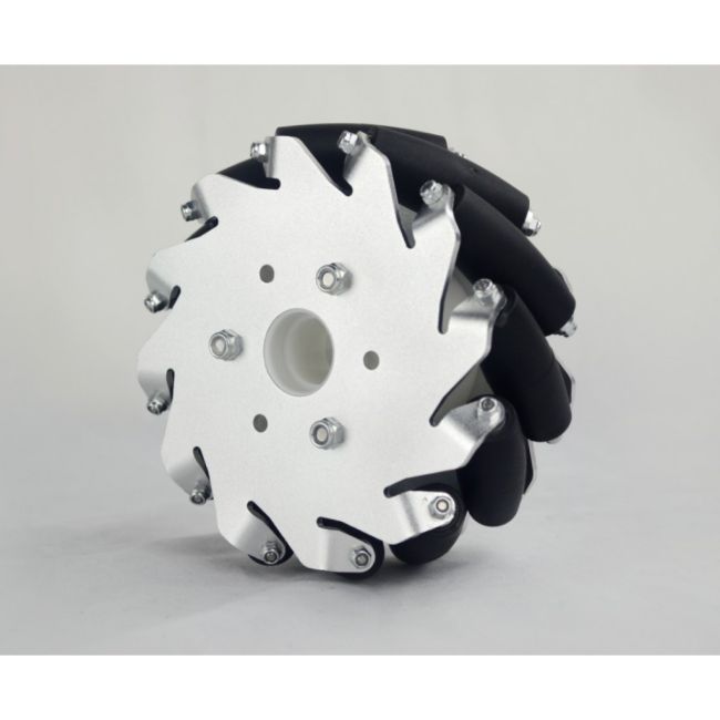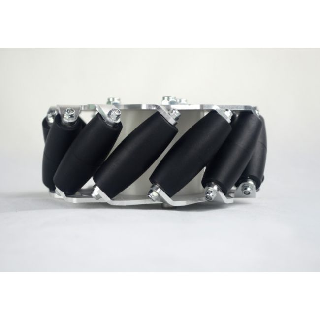 127mm (5 inch)Mecanum wheel is comprised of 12 rollers. It is driven independently. Mecanum wheel can be capable of moving in any direction,no need to change the directions the wheel spin. Every of the four wheels contain a series of rollers which have an axis of rotation at 45° to the plane of the wheel in a plane parallel to the axis of otation of the wheel attached to its circumference.