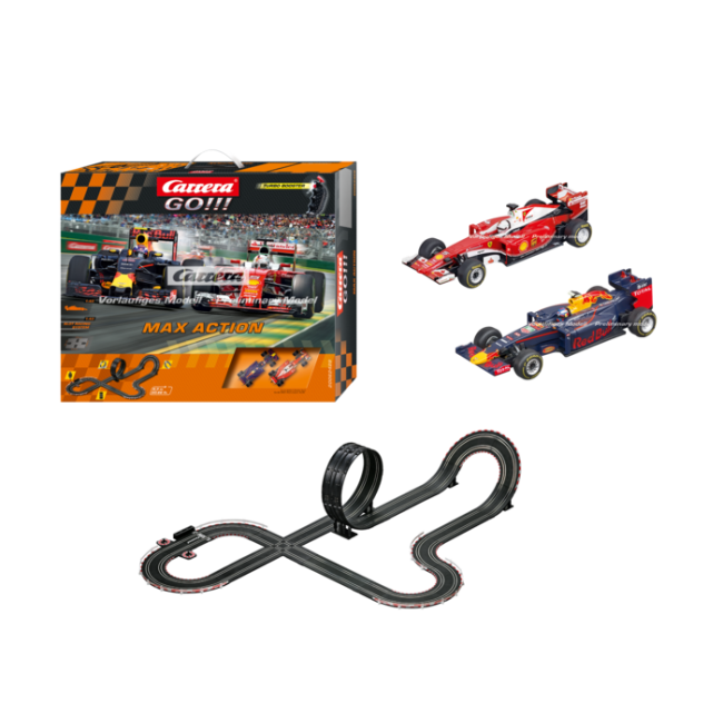 Spectaculaire racebaan van Carrera Go!!! Deze MAX Action set is een 6,30 meter lange racebaan met o.a. een looping en een hoge bocht. Maak de race extra spannend door onder het rijden de superbooster te gebruiken.