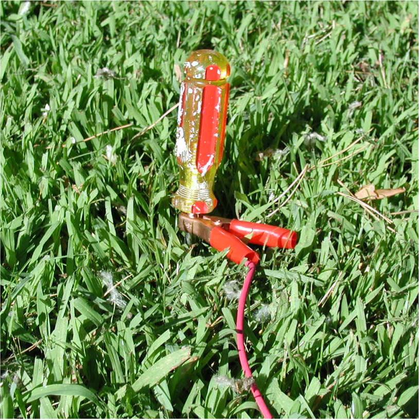 | 1. Throw the Input Float into the pool. Electricity flows from the Booster through the float into the pool. | 2. Attach the Ground Cable to a grounded object outside the pool. A ladder anchor, diving board anchor, or ground stake work well. |
