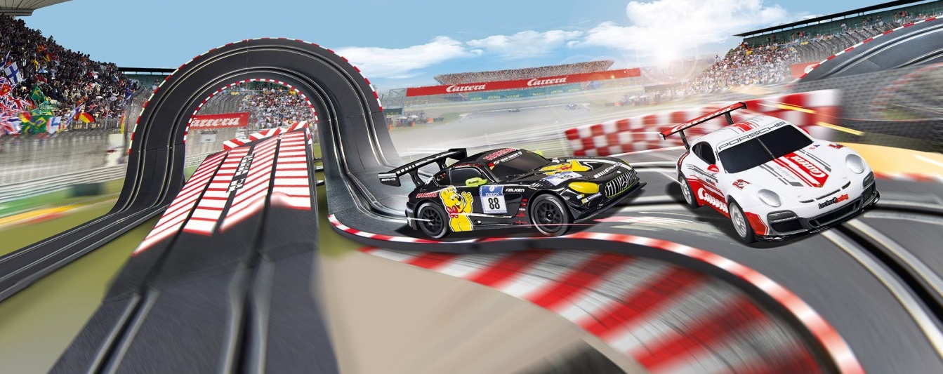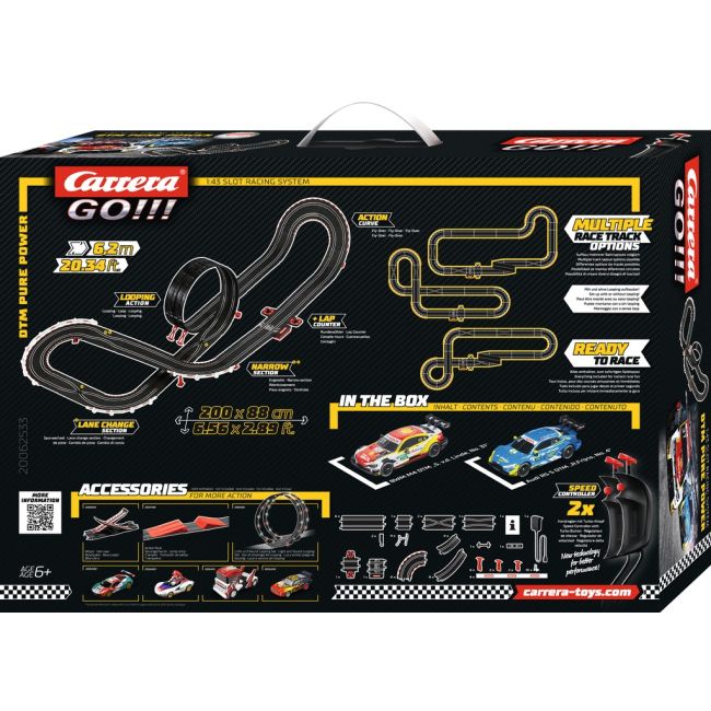 De trouwe voertuigen op een schaal van 1:43 lijken verwarrend veel op hun modellen uit de DTM-raceserie. Thuis kun je nu laten zien wie de titel verdient op het 6,2 meter lange Carrera-circuit met lange rechte stukken, fly-over, bottleneck, baanwissel en een indrukwekkende looping. Hier moet je niet alleen veel vaardigheid tonen op de handcontroller, maar ook doorzettingsvermogen.