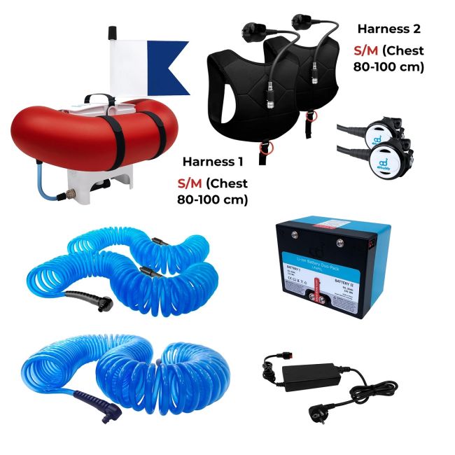 Dit pakket biedt de optie voor een enkele duiker om tot 12 meter (40 ft) diep te duiken of voor twee buddy-duikers om elk tot 6 meter (20 ft) diep te duiken. Wees flexibel om uw AirBuddy in te stellen op basis van uw huidige voorkeur.