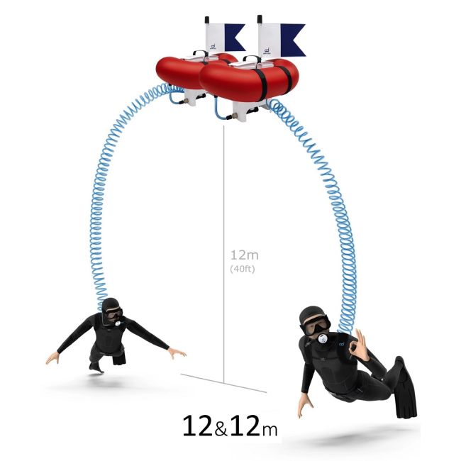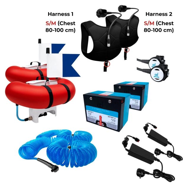 Dit pakket is geschikt voor twee duikers met ieder een eigen AirBuddy. Koppel 2 AirBuddies aan elkaar en ontvang een sessie van 55 minuten op een maximale diepte van 12 meter (40 ft) voor beide duikers. Twee AirBuddies zullen samen in een formatie drijven om verstrikking van de slangen te voorkomen.