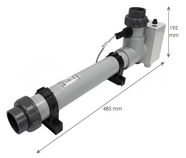 De verwarmingsmantel is gemaakt van chemisch bestendig kunststof. Verwarmingsspiraal van TITANIUM. De verwarming is geschikt voor alle behandelingen van zwembadwater, in het bijzonder voor zout water.