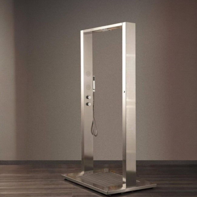 SAMOA douche - warm en koud water douche - een complete douche voor het hele gezin van Ideal Eichenwald De SAMOA-douche van IDEAL Eichenwald is een 'poortdouche' met een brede hoofddouche, twee tegenover elkaar geplaatste lichaamsdouches en een handdouche. Een blikvanger in uw tuin voor het hele gezin.