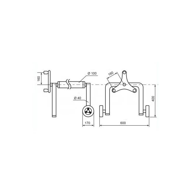 De afstand tussen de wielen is 600 mm, de hoogte van de telescopische stang vanaf de grond is 400 mm en de stang is extra versterkt met een diameter van 100 mm (standaard lieren zijn ca. 80 mm).