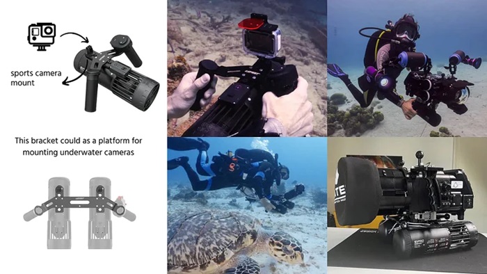 Onze dubbele jetbeugel kan worden gebruikt om eenvoudig zelf een onderwatercamera te installeren met clips en riemen. De dual jet-modus biedt voldoende stuwkracht om uw duikuitrusting moeiteloos mee te nemen met uw zware schiet- en opnameapparatuur. Als u de LEFEET S1 PRO gebruikt, kunt u een stabiel tempo aanhouden en vloeiende beelden vastleggen zonder mogelijke micro-trillingen die kunnen optreden als u uw camera in de hand houdt.