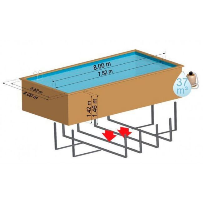 Het resultaat dat met deze zwembaden wordt bereikt, is veruit superieur aan andere zwembadreeksen zoals buisvormig of staal. Dit is te danken aan de kwaliteit van het massief hout en de robuustheid van de constructie. Het moet op een gladde, stevige en volledig vlakke vloer worden geïnstalleerd. Een betonnen ondergrond is absoluut noodzakelijk en het wordt sterk aanbevolen om een betonplaat van 915 x 470 x 17 cm te plaatsen.