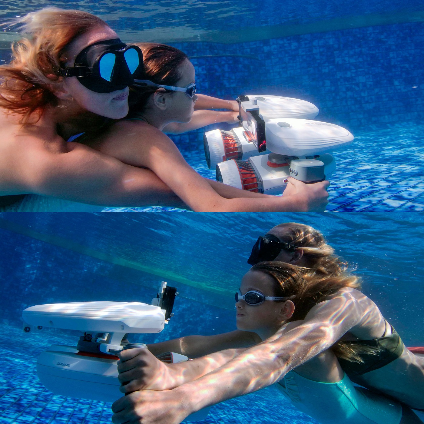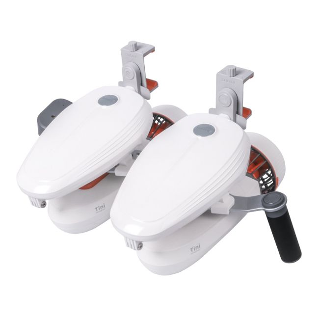 Krachtig en gemakkelijk te bedienen: Tini's motor is zo krachtig dat hij net zo snel kan gaan als de meeste onderwaterscooters met dubbele motor. Vertraag tot 1,1 m / s om van het uitzicht te genieten, of zo snel als 1,4 m / s om de sensatie te ervaren. Houd de controle met beide handen om manoeuvre en balans te brengen. + Draadloze besturingstechniek.