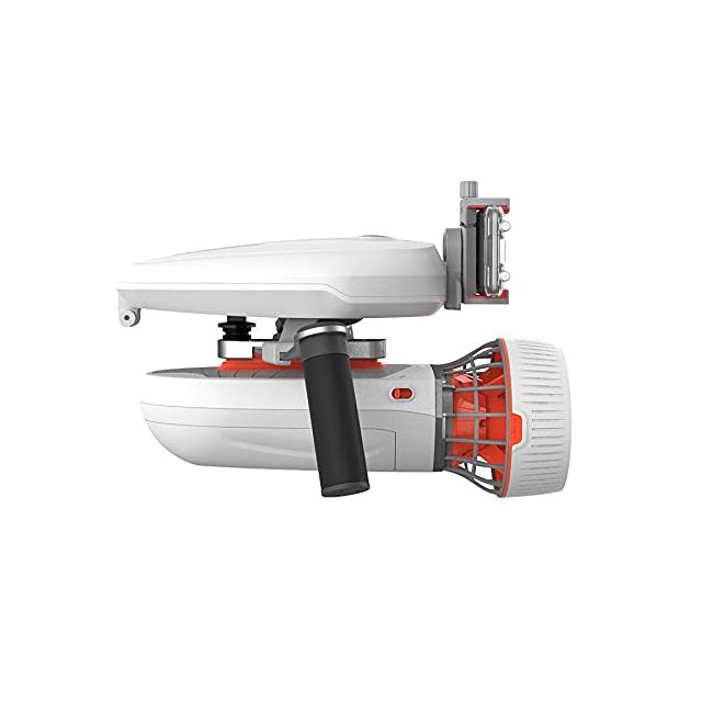 Compacte onderwater single-motor scooter met Floater WhiteShark TINI. U kunt de floater bevestigen voor extra drijfvermogen om te snorkelen en te vliegen door het water of eventueel los te maken om te duiken naar een diepte van maximaal 30 meter om het prachtige onderwaterleven te bewonderen.