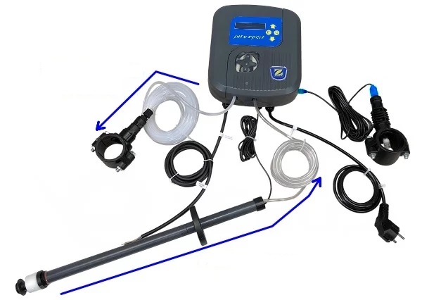 Besturingseenheid met pomp, zuig- en afvoerbuis voor chemie, zuigstang uit vat chemie, injector met buishouder, pH-sonde, pH-sondehouder, kalibratieoplossingen voor pH-sonde, onderdelen voor bevestiging van de besturingseenheid aan de muur, stroomkabel.