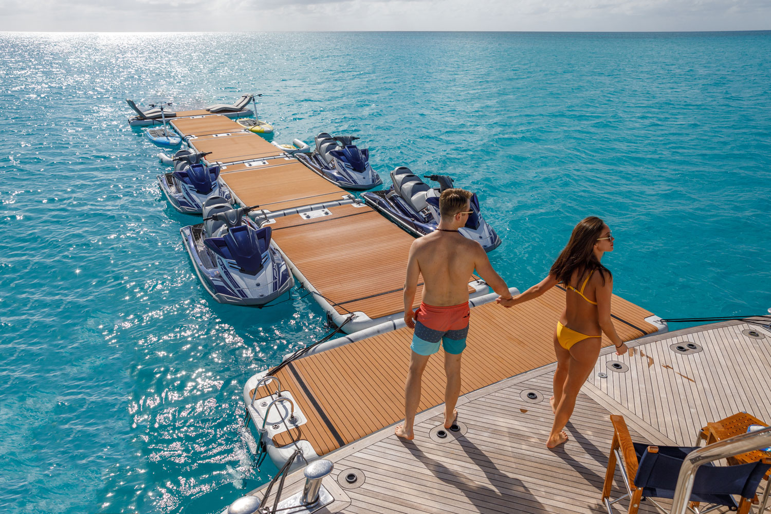 Met deze nieuwe en innovatieve jachtplatformen creëert u uw eigen strandje bij uw boot of installeert u elegant een drijvend terras in de zee of op het meer. Dit hoogwaardige product imponeert met zijn elegantie en verfijnde design.