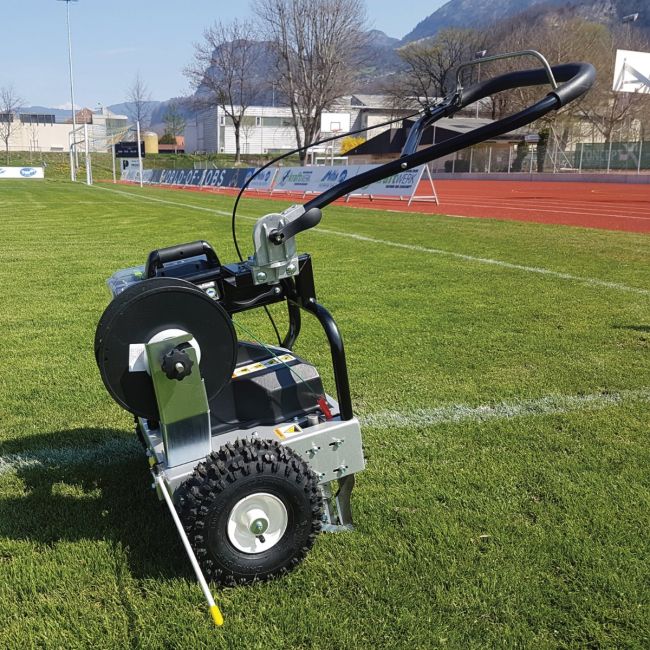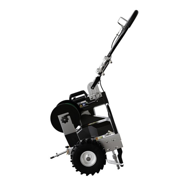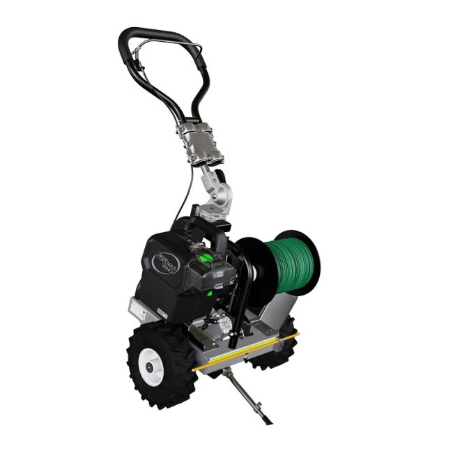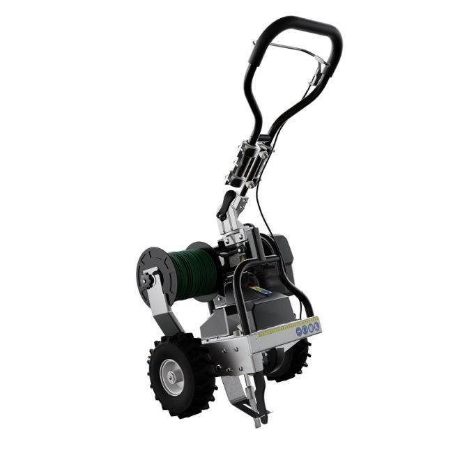 Professionele kabellegger van Portable Winch voor het leggen van perimeterdraad. Werkt zeer snel en eenvoudig tot 420 meter per volle accu. U hoeft geen draadpennen te gebruiken aangezien deze kabellegger het perimeterdraad tot 6cm onder de graszoden aanbrengt. Er is dus ook geen gevaar voor het eventueel verticuteren van uw gazon. De gewenste accu kan naar wens worden meegeleverd.