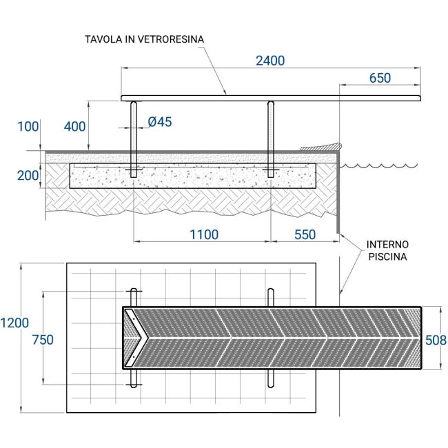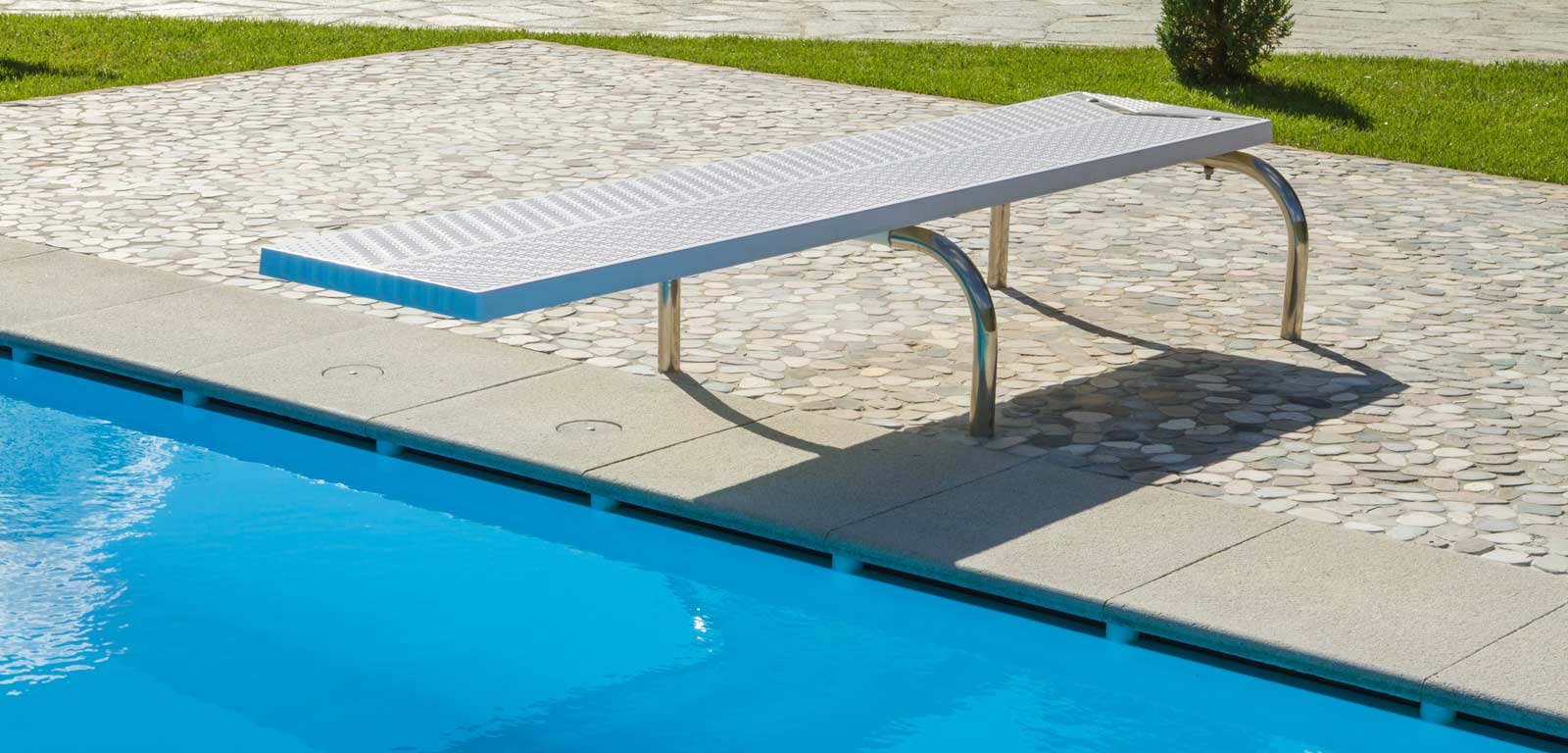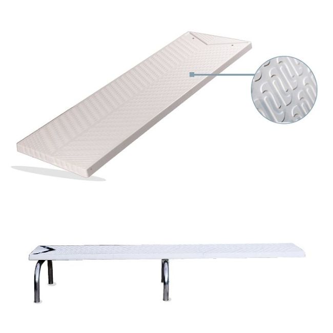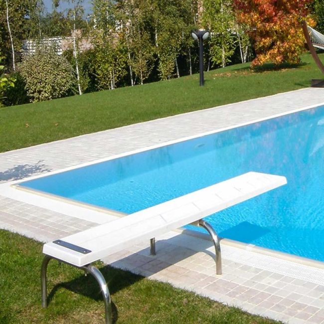 De Rana duikplank is compleet met houten verstevigingen, een middenafvoerkanaal en een antislip oppervlak en steekt over het zwembad uit op een hoogte van ongeveer 60 cm vanaf het water.