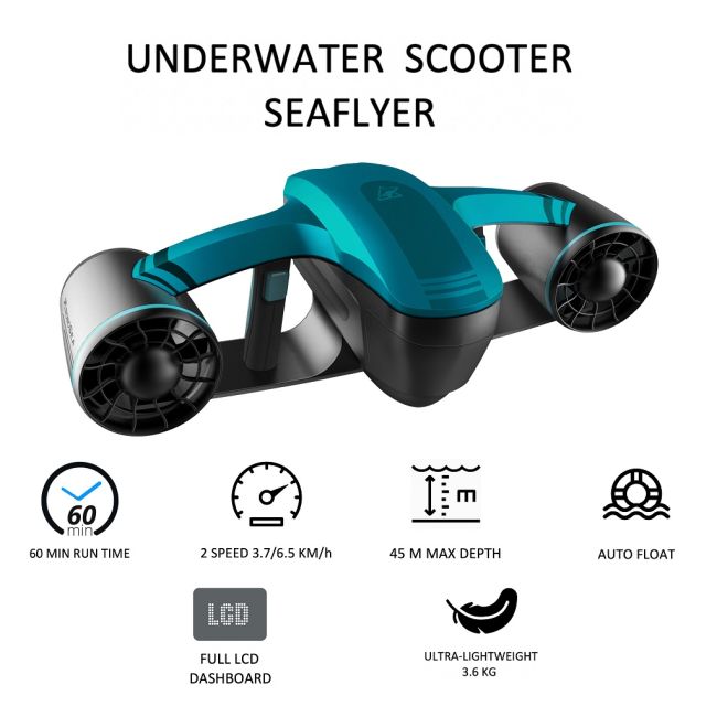 Slank, compact en gebruiksvriendelijk, de Seaflyer verpakt niet alleen een punch met zijn snelheid van 8 kmp/u en duikdiepte van 40m, maar weegt daarentegen ook slechts 3,7 kg.