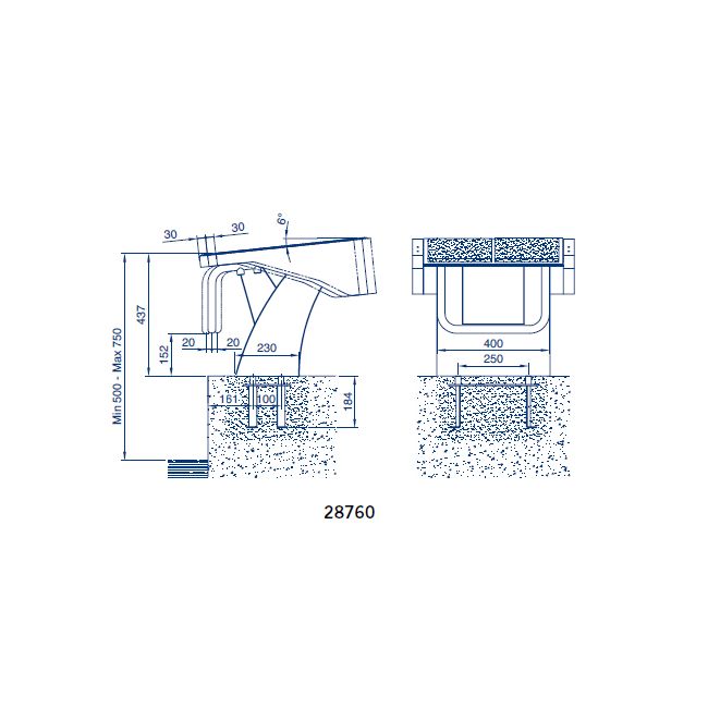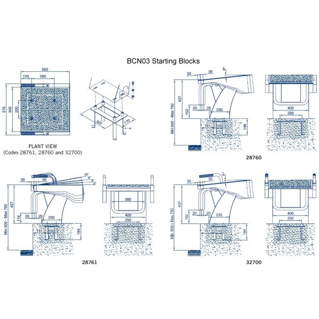 Inklapbare handgrepen aan de zijkant. De zwemmer kan gemakkelijk van positie veranderen en naar wens omhoog of omlaag gaan. Daarnaast is er de Eco-versie zonder verstelling (vast op 6°) of zijhandgrepen. Het podium is gemaakt van AISI-316 roestvrij staal. Het standaard startplatform kan worden verwijderd om montage van het elektronische timingsysteem van het merk Omega mogelijk te maken.