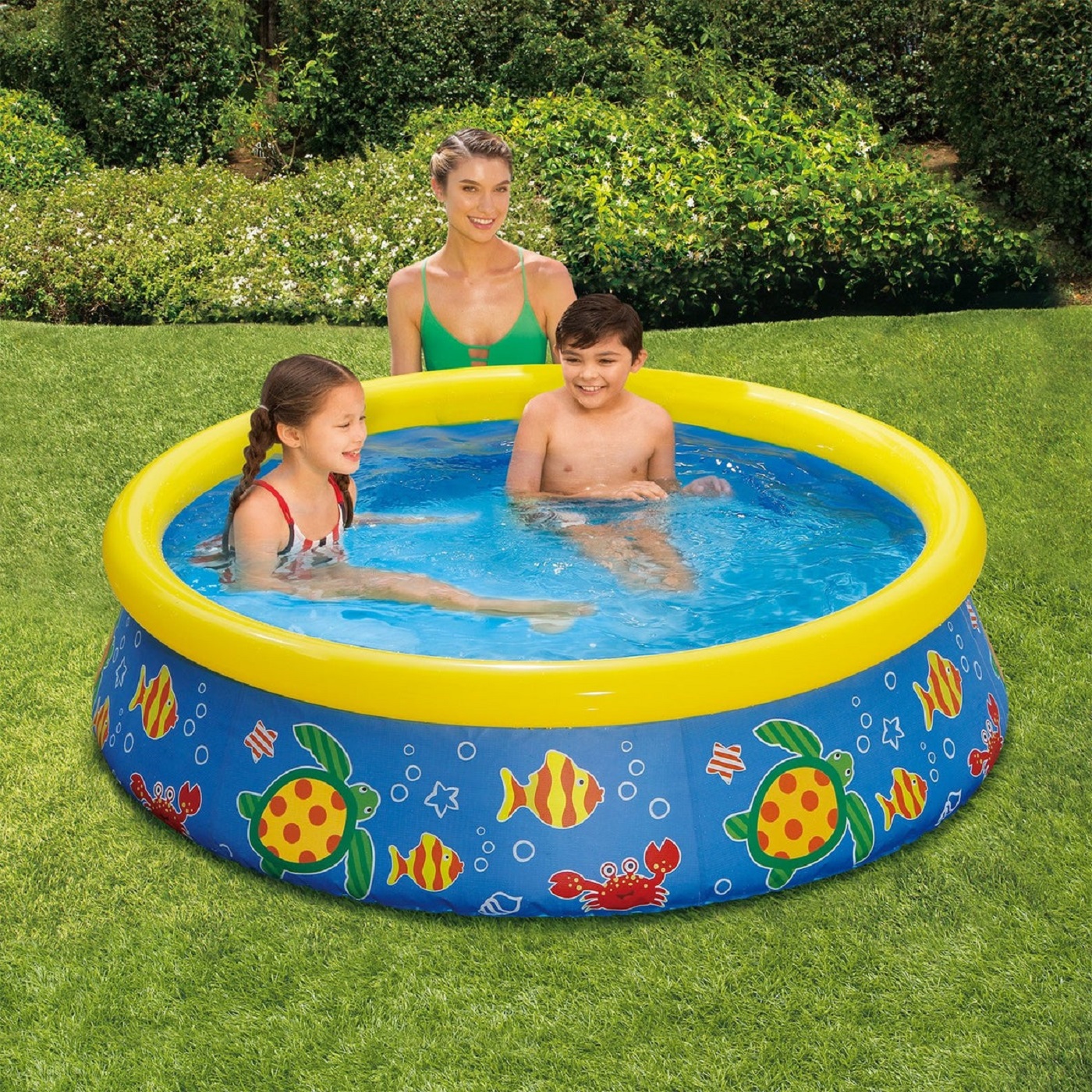 De Swing Kids Pool is een leuk kinderbad met vrolijke motieven, door zijn diameter is het toch een ruim zwembad met een opblaasbare rand en is een mooie aanwinst voor de kinderen tijdens de warme zomerse dagen. De Swing Kids Pool in de afmeting 152 x 35 cm is gemaakt van een liner van absolute topkwaliteit. De dikke liner bestaat uit robuuste 3 lagen. De 2 buitenste lagen zijn gemaakt van flexibel PVC. Terwijl de middelste laag van versterkt polyester is. Hierdoor heeft dit zwembad sterke, maar toch zeer flexibele wanden. Het zwembad is binnen 10 minuten opgezet, waarna het direct gevuld kan worden met ruim 401 liter.