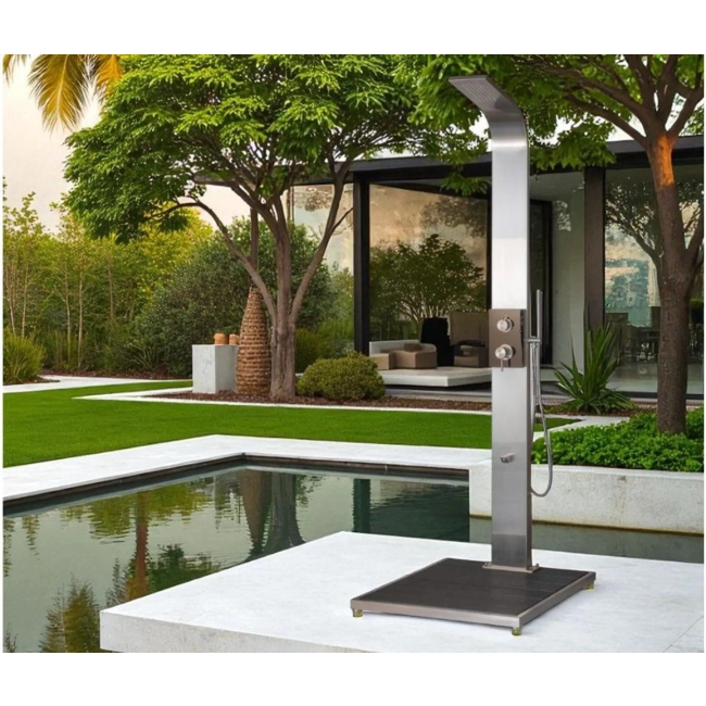Innovatieve, nieuwe generatie tuindouche, vervaardigd van hoogwaardig V4A roestvrij staal, met WPC-platform, inclusief hand- en hoofddouche, mengkraan, afneembaar achterpaneel, gemonteerd op een grondplaat.