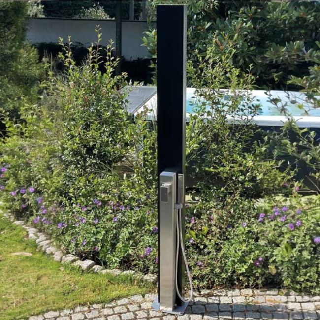 Venus Solar tuindouche met koud en warm water van Ideal Eichenwald De Venus solar tuindouche kenmerkt zich door een eigentijds en open ontwerp. De zwart gelakte watertank vormt een elegante combinatie met de glanzende roestvrijstalen armaturen. De douchekolom herbergt een watertank met een inhoud van circa 25 liter. Dankzij de plaatsing van de tank kan de douche zonlicht van alle kanten opvangen.