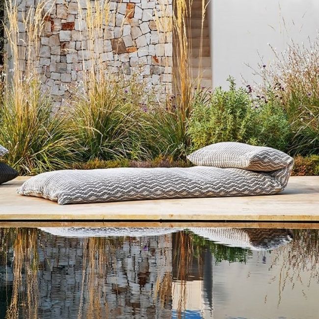 Een bijzonder buitenbed dat direct op de grond rust . De vorm doet denken aan een Japanse futon, terwijl de stoffen bekleding doet denken aan een mediterrane stijl. Verkrijgbaar in twee verschillende bekledingen , het golvende weefsel geeft dit product een zomerse uitstraling, geschikt voor het decoreren van zwembaden en tuinen.