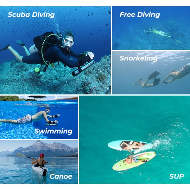 Ingekapseld in een behuizing van aluminiumlegering en uitgerust met een uniek ontwerp voor straalaandrijving, kan de subnado gemakkelijk een voorwaartse snelheid van maximaal 1,4 m/s bereiken , waardoor u de ultieme onderwatersensatie krijgt. Bovendien, als je een liefhebber van diepduiken bent, is de subnado, met een maximale duikdiepte van 60 meter, je beste keuze voor een scootmobiel.
