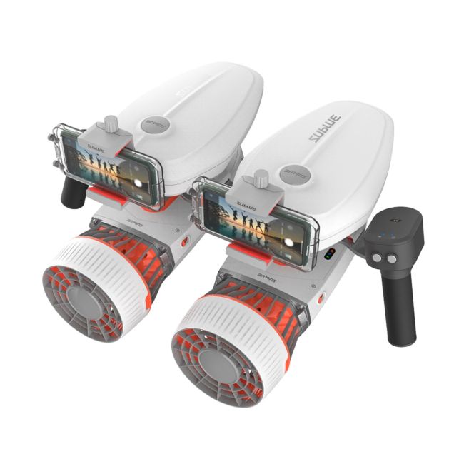 Met het unieke modulaire ontwerp van WhiteShark Tini kun je eenvoudig twee scooters aan elkaar bevestigen om het vermogen en het plezier te verdubbelen. Door twee scooters aan elkaar te koppelen, kunnen ervaren duikers door het water vliegen, waardoor het de snelste scooter met twee motoren op de markt is.